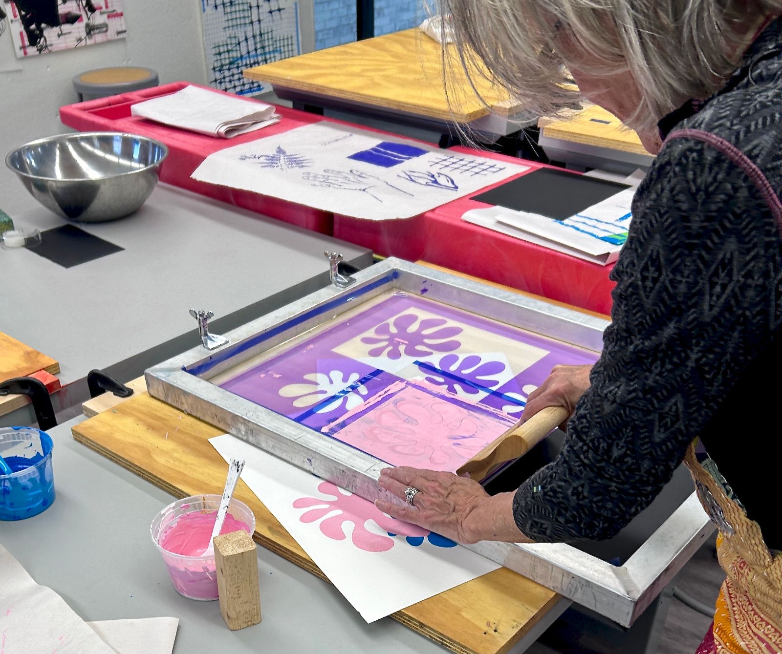 Participants will experiment with analog methods for making screenprinting negatives— including stencil making, ink drawing, drawing fluid, and more—as well as considering play during printing itself, in order to achieve dynamic and layered prints. In this workshop, we will also touch on the full screenprinting process including coating screens, burning negatives, registration, color mixing, washing and reclaiming screens, and more. Artists in this workshop are encouraged to work independently, support each other, and take risks.